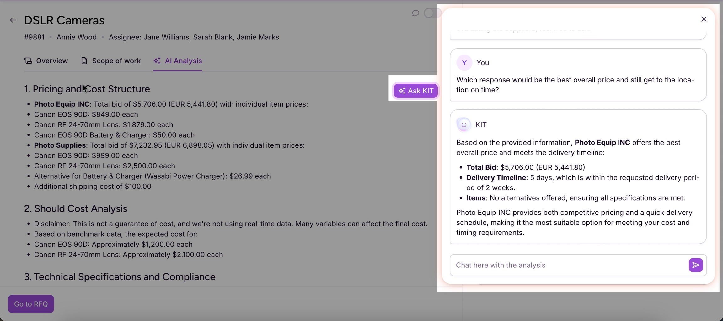 The AI Bid Analysis Agent helps you analyze supplier responses after an event closes. It provides a clear, structured analysis of key details like pricing, delivery timelines, vendor capabilities, and risk assessments. You can also chat with the AI agent to ask questions and get more insights.