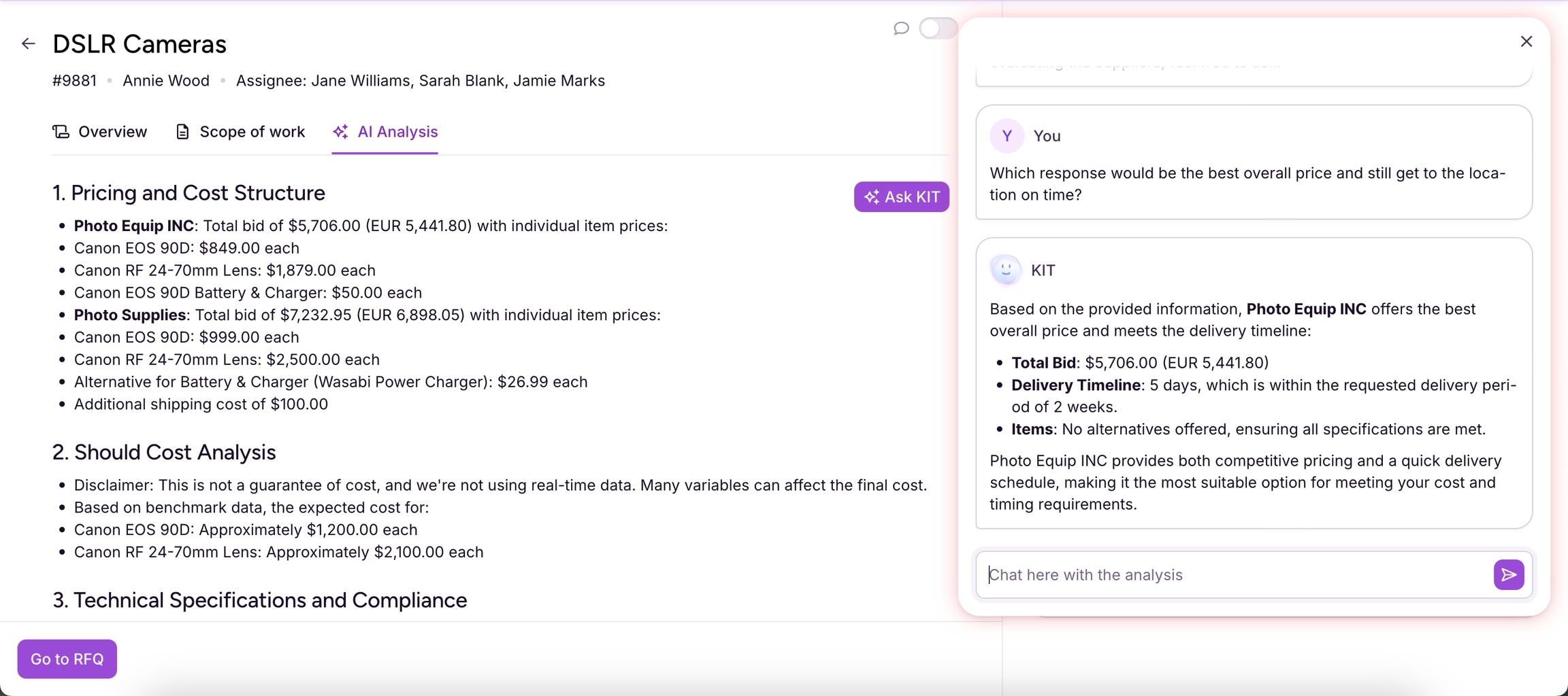 Once your event closes, you can review an analysis from the AI Analysis tab. The analysis includes a structured analysis of key details like pricing, delivery timelines, vendor capabilities, and risk assessments