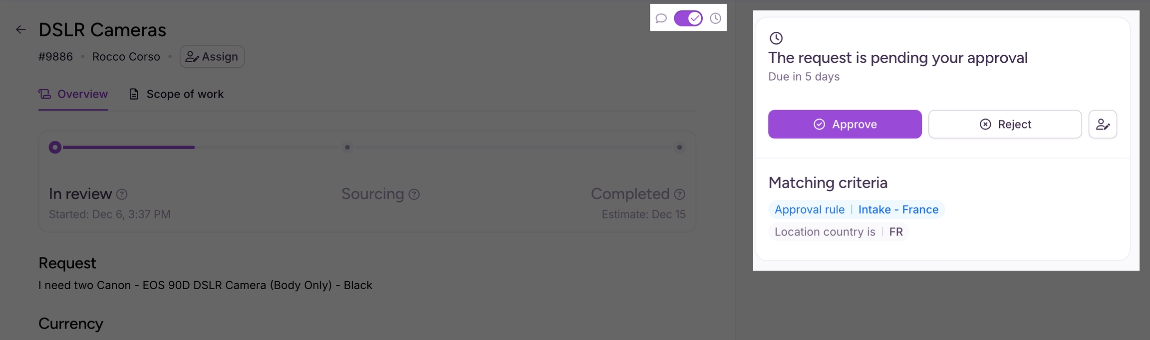 With approvals, intake requests are automatically routed to approvers based on request data, such as location, budget,or role. By automating this process, you ensure that each request is reviewed and approved according to predefined rules, maintaining compliance and efficient workflow management.