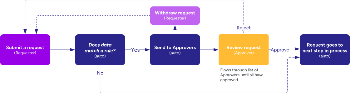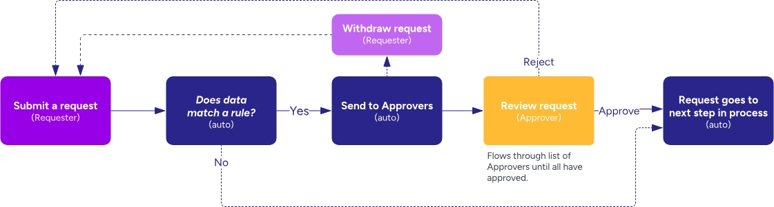 After setting up the rules, any new requests that match the rule criteria will be routed to first defined approver. The request will continue through the list of approvers, ensuring all necessary approvals are obtained before the request goes to the next step in the process.