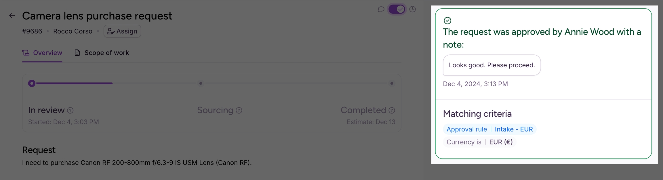 With approvals, your intake requests are automatically routed to approvers based on request data, such as location, budget, or role. By automating this process, you ensure that each request is reviewed and approved according to predefined rules, maintaining compliance and efficient workflow management.