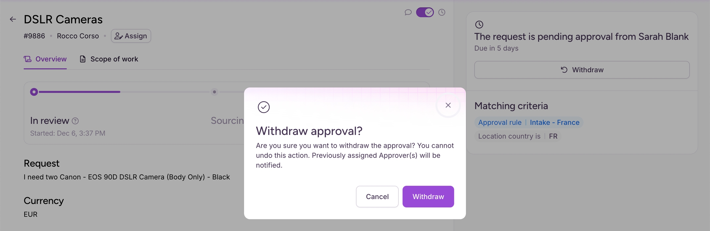 Click Withdraw. The Withdraw approval? screen displays.